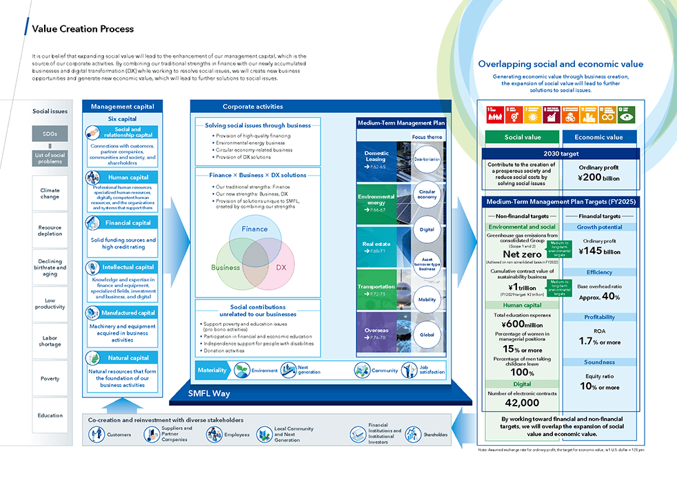 SMFL has steadily achieved growth by combining different types of capital, including our connections with customers, partner companies, and society; human and organizational capital; business-related knowledge and expertise; and our solid funding sources. Moving forward, we will continue to pursue sustainable growth and greater corporate value through synergies between these forms of capital while strengthening those types of capital that we lack.