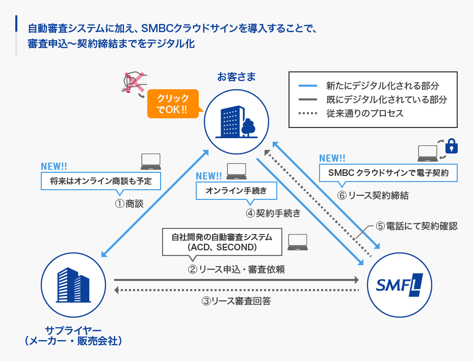 幸い、小口リース契約向けの自動審査システム「ACD」とWEB審査申込システム「SECOND PLUS」の運用が既に始まっていた。このシステムに加え、オンラインでリース契約の申込を行えるシステムと、電子契約締結を可能にする「SMBCクラウドサイン」を導入し、「審査申込から契約締結まで」のビジネスプロセスをデジタル化した。